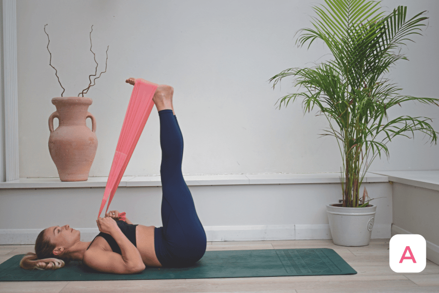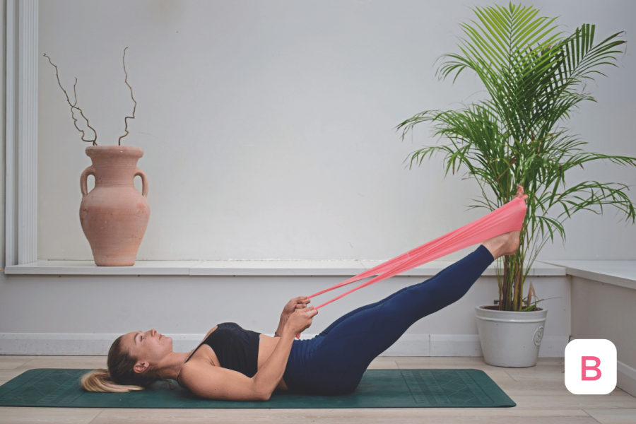 2. With legs together and long, point the toes and press the feet into the band to lower them towards the ground, only going as far as you can while maintaining an imprinted or neutral spine (B). Then, lengthen them back up towards the ceiling while flexing the feet.