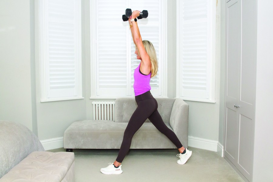 Push through your front left heel and return to the start position, driving the dumbbells high above your head again. Repeat 10 times on each side.
