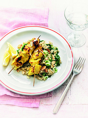 Spoon the rice onto plates and top with the chicken skewers. Serve with lemon wedges.