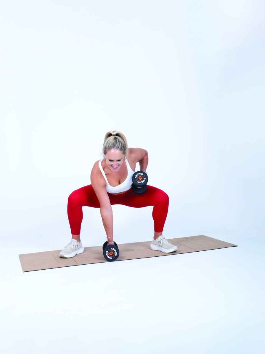 • Hold a dumbbell in each hand, weight resting on the floor.