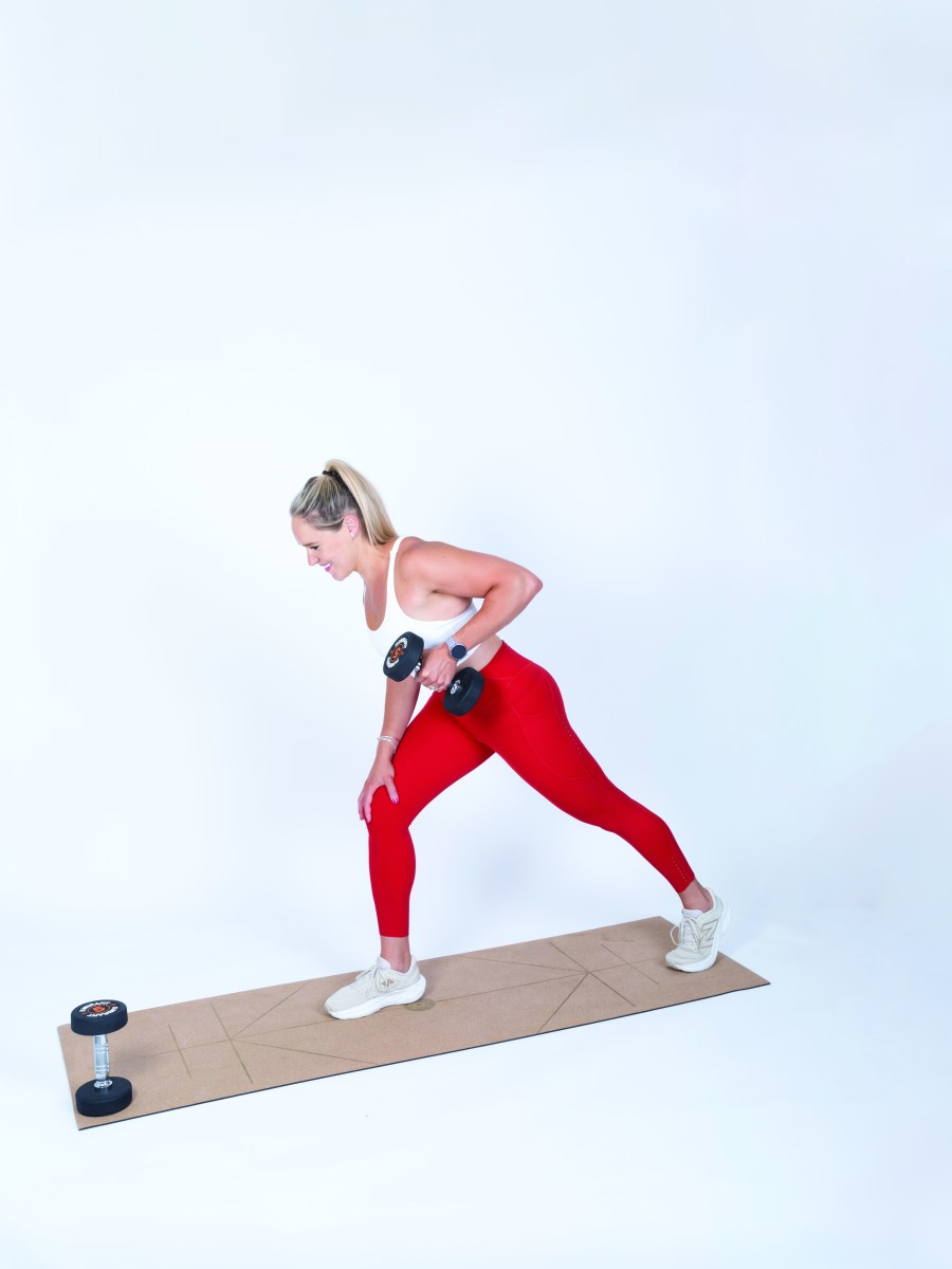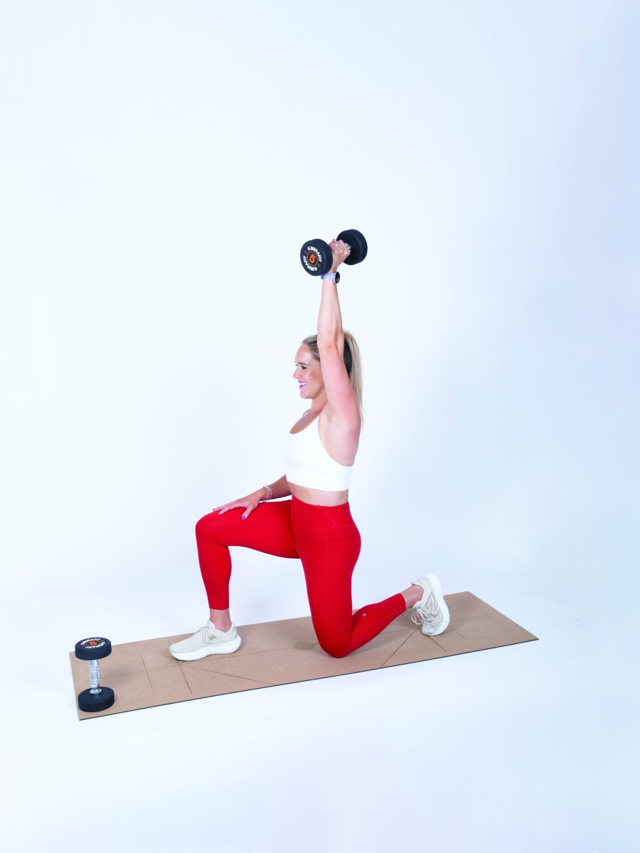 • Hold a dumbbell at shoulder height on the same side as your supporting knee.