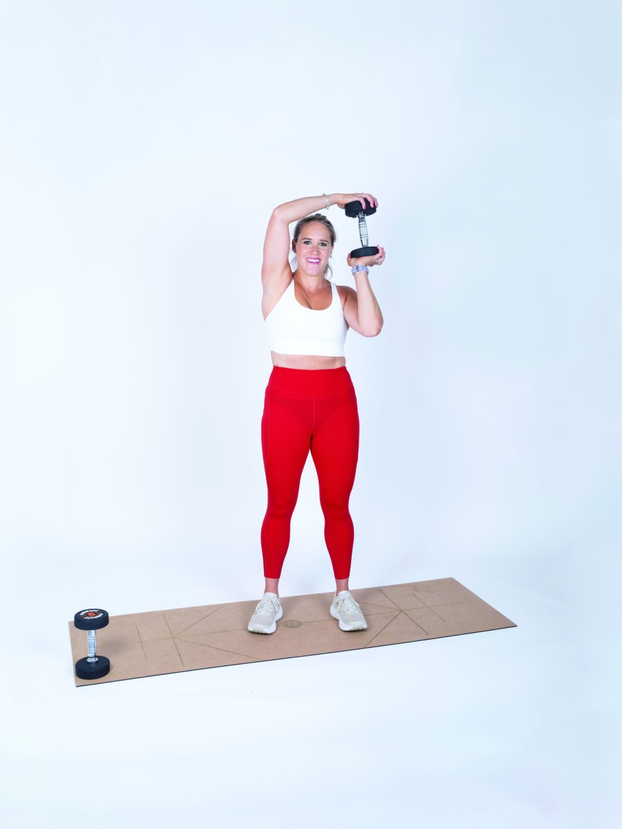 • Brace your core and press the weight overhead, keeping ribs tucked.
