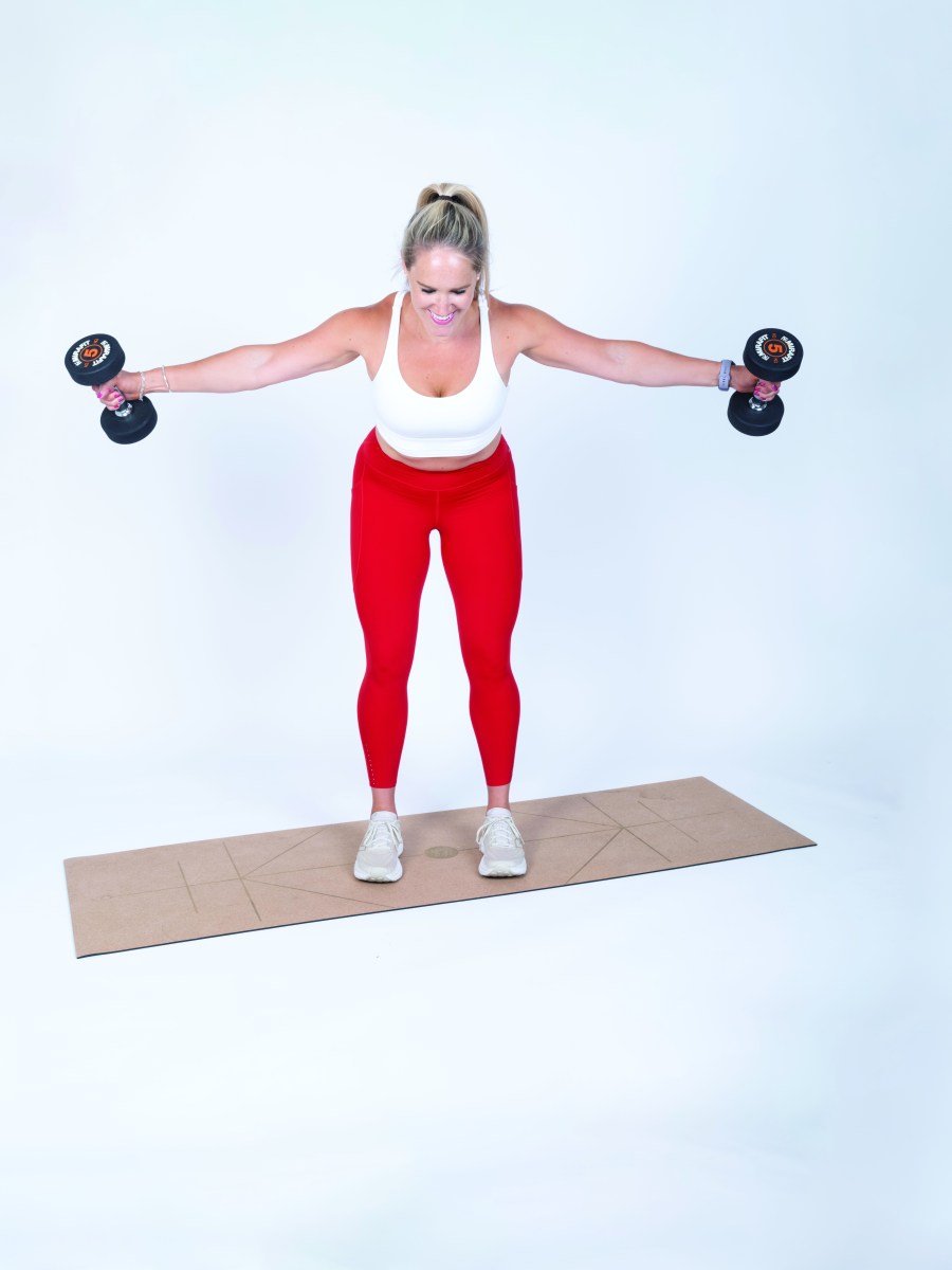 • With a slight bend in your elbows, lift your arms out to the sides.